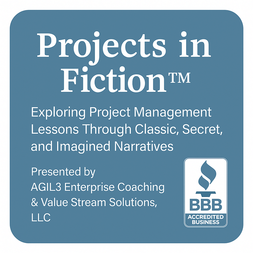 Projects in Fiction™ is a one-of-a-kind course and narrative-based reading series from AGIL3 Enterprise Coaching & Value Stream Solutions, LLC. It weaves classic literature, declassified case studies, and imagined initiatives into unforgettable lessons in strategy, planning, leadership, and value delivery.