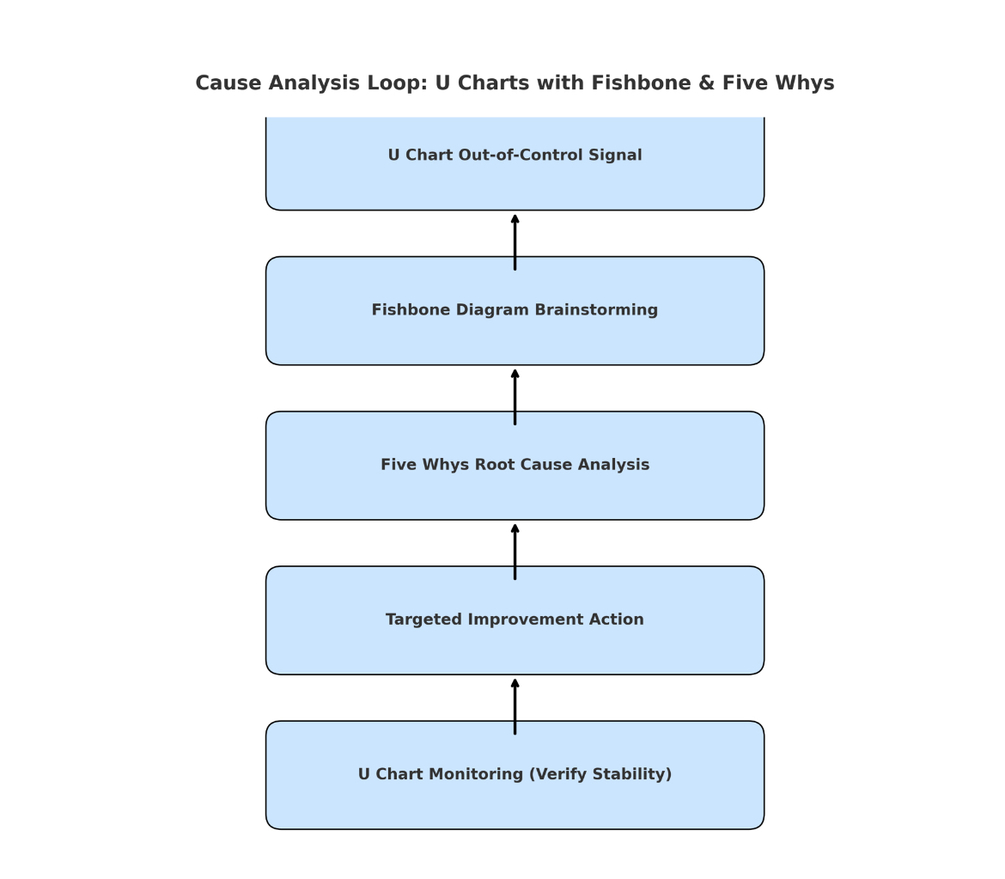 • Root cause analysis tools (Five Whys + Fishbone) integrated with U chart data.
